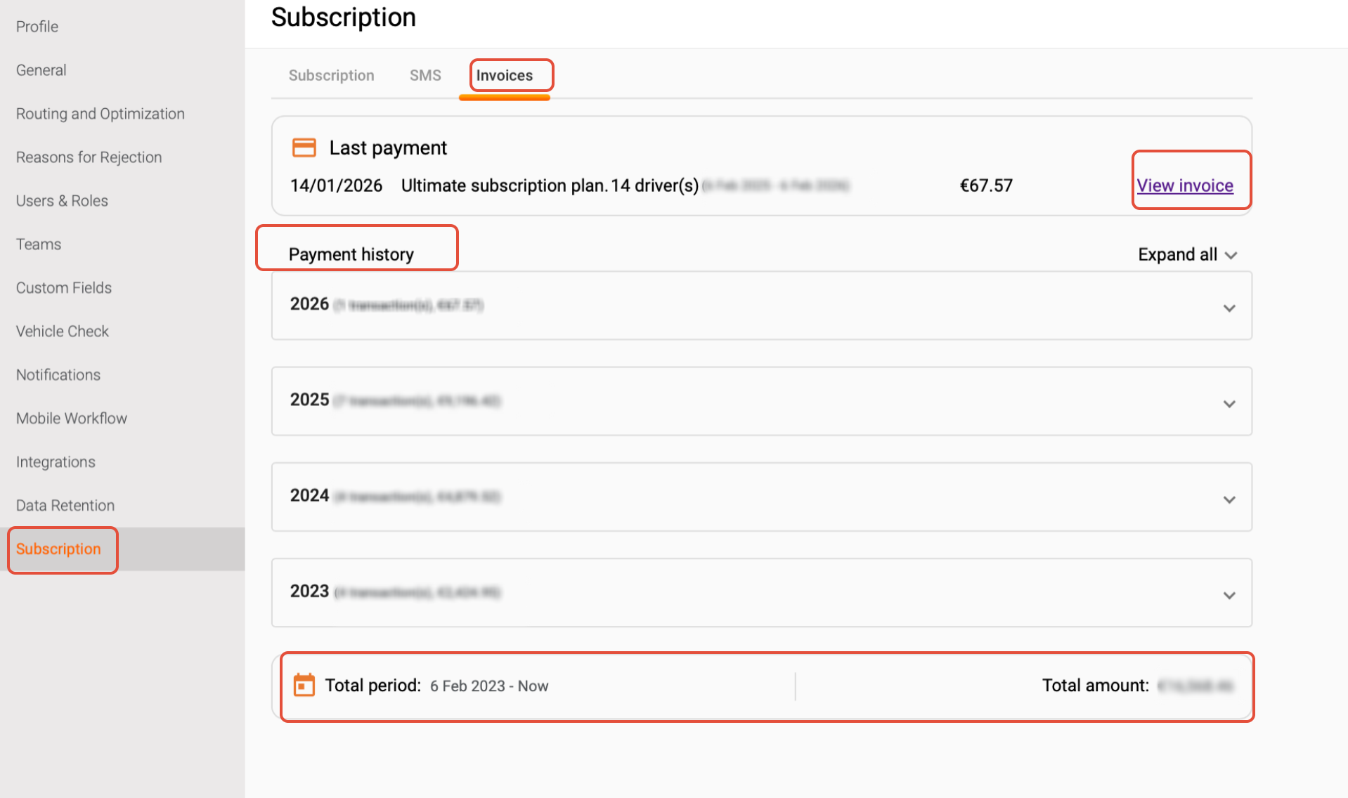 Within the Settings menu, locate and click on Subscription. This section contains all the information related to your subscription plan, including billing details and invoices. If you do not see the Subscription tab you might be limited in your permissions, please address this issue to the account administrator or the account owner.