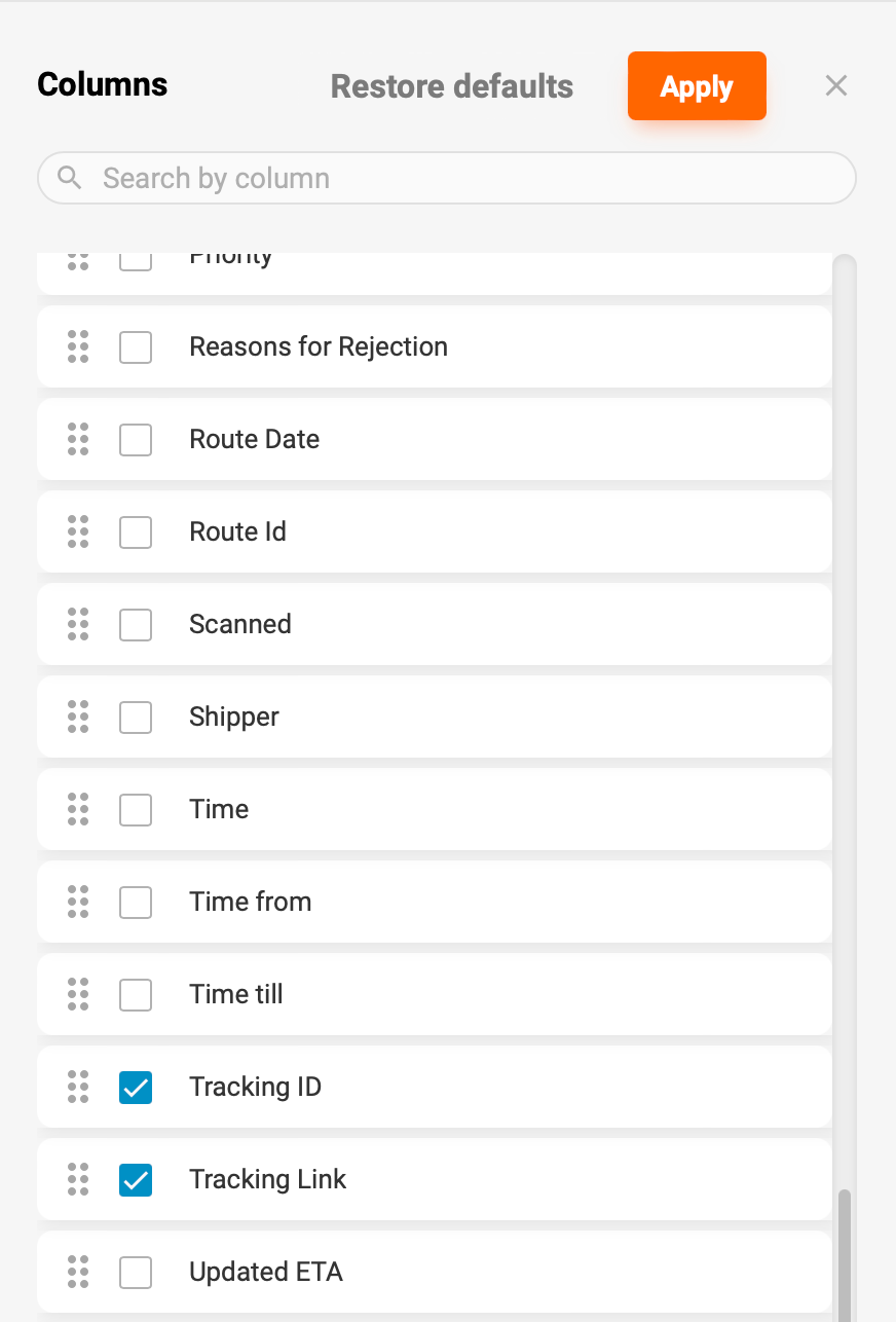 To begin, navigate to the Orders tab within your Track-POD dashboard. Here, you will need to ensure that the Tracking ID and Tracking Link columns are visible. To do this, click on the Columns selection option. From the list that appears, simply tick the boxes next to Tracking ID and Tracking Link to activate these columns. This will allow you to view the relevant information for each order at a glance.