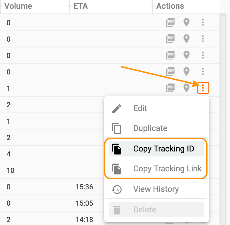 If you need to provide a tracking ID or tracking link for a specific order, you can easily copy this information to your clipboard. Locate the order in question and click on the Actions icon (represented by three dots) next to that order. From the dropdown menu, select the option to copy the tracking ID or tracking link. This is particularly useful for quickly sharing tracking details with customers via email or chat.