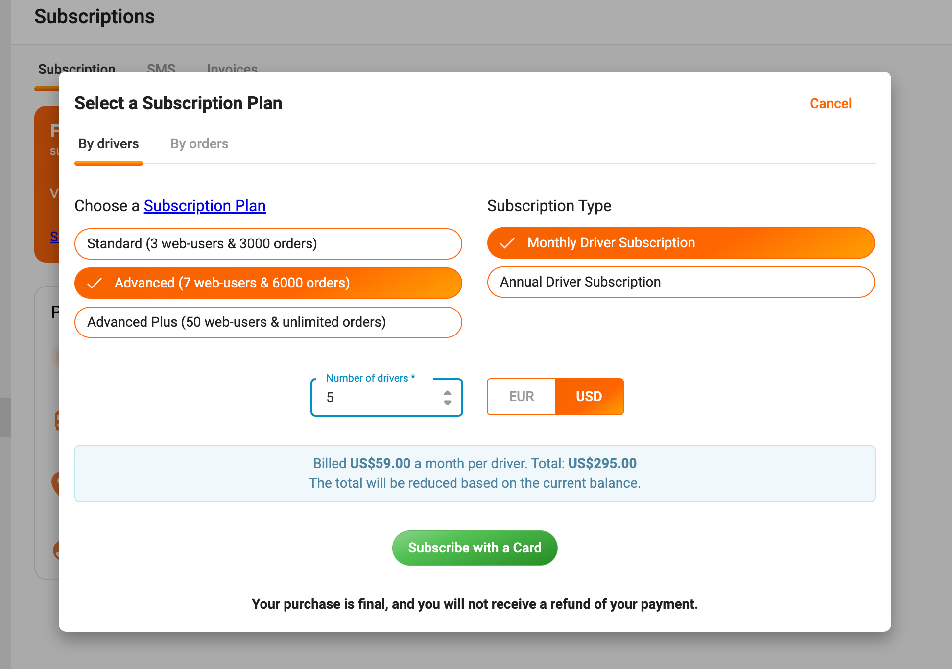 If you find that you need to reduce the number of driver licenses instead, you can follow the same procedure. Simply edit the number of drivers in the "No. of drivers" field to a smaller value, and click Update. Your account will be adjusted accordingly.
