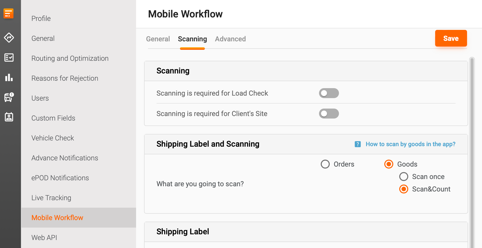 1. Accessing Settings: Begin by navigating to Settings in your Track-POD dashboard. From there, go to Mobile Workflow and select Scanning. This is where you can adjust your shipping label settings.