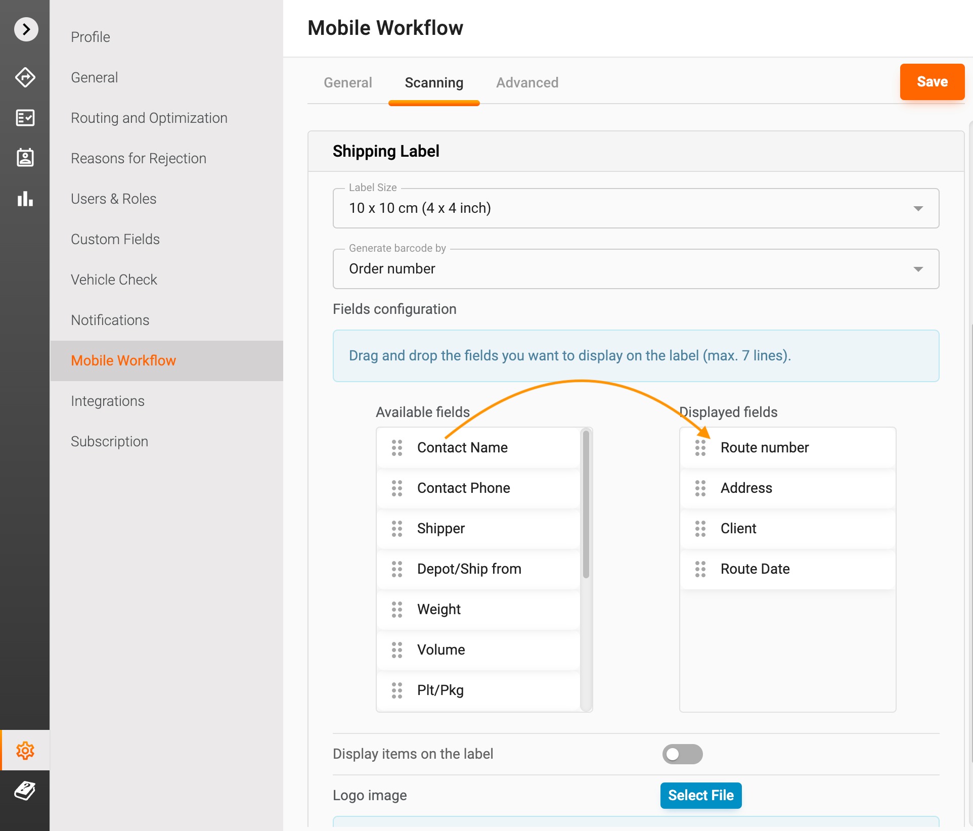 7. Fields Configuration: You can customize the information displayed on your shipping labels by selecting necessary fields from the Available fields section and dragging them to the Displayed fields section. You can include up to 7 fields, including any custom fields you have created.
