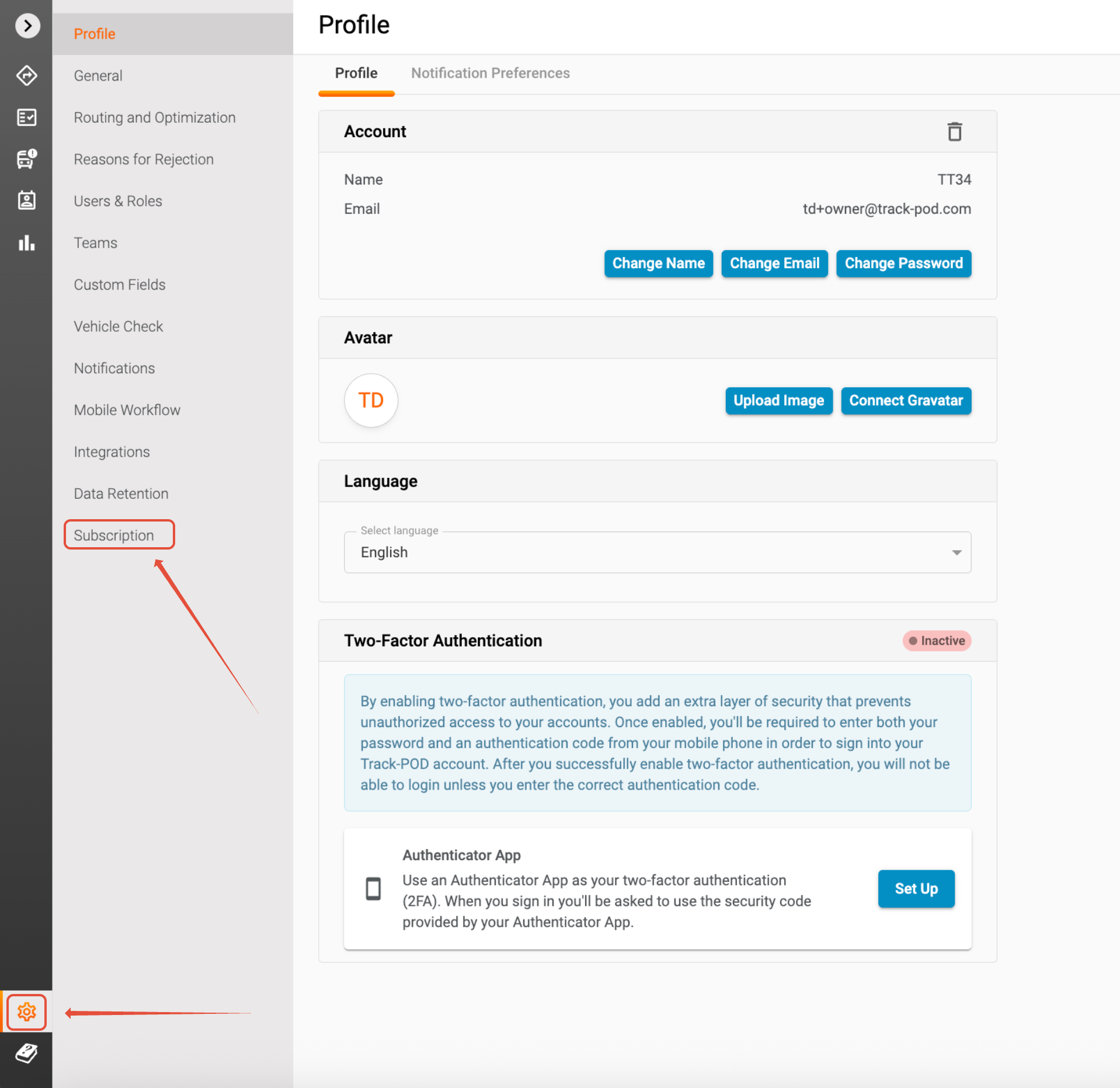 To begin, log in to your Track-POD account. Once you’re logged in, navigate to the Settings section. You can find this option in the main menu, in the bottom left corner of your dashboard. Click on Settings to proceed.