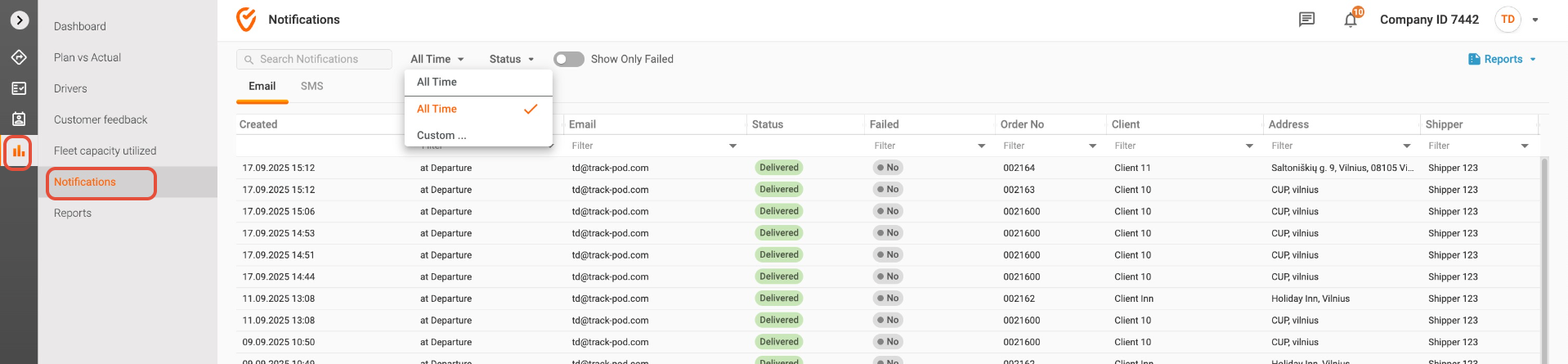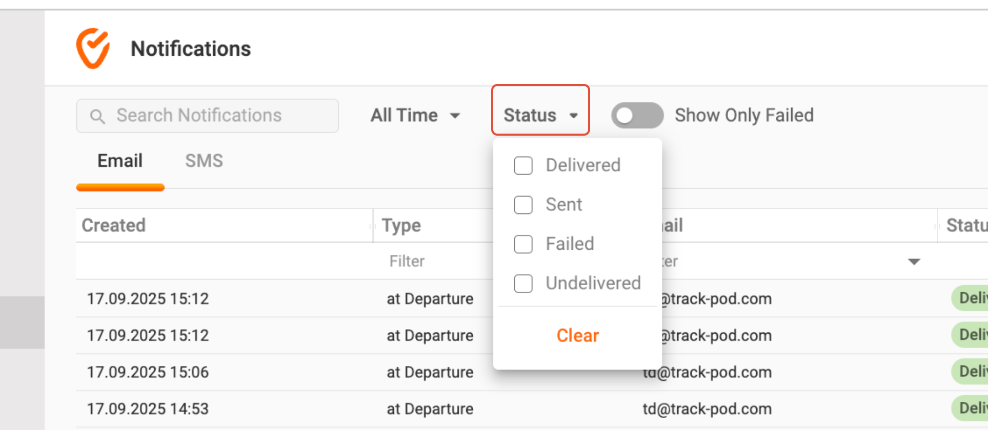 To streamline your search, notifications can be filtered by their status. You can choose from categories such as Delivered, Sent, Failed, and Undelivered. This filtering option is particularly useful if you're looking to identify any issues with your notifications.