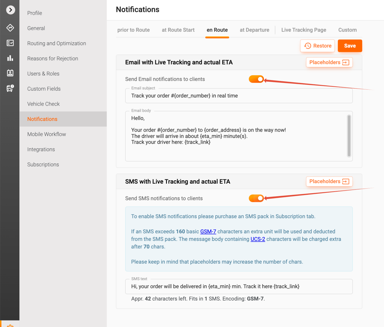 - Live Tracking Emails and SMS (at Route Start): These notifications are sent at the start of the delivery route. Ensure that this setting is activated so your customers can track their orders in real-time.