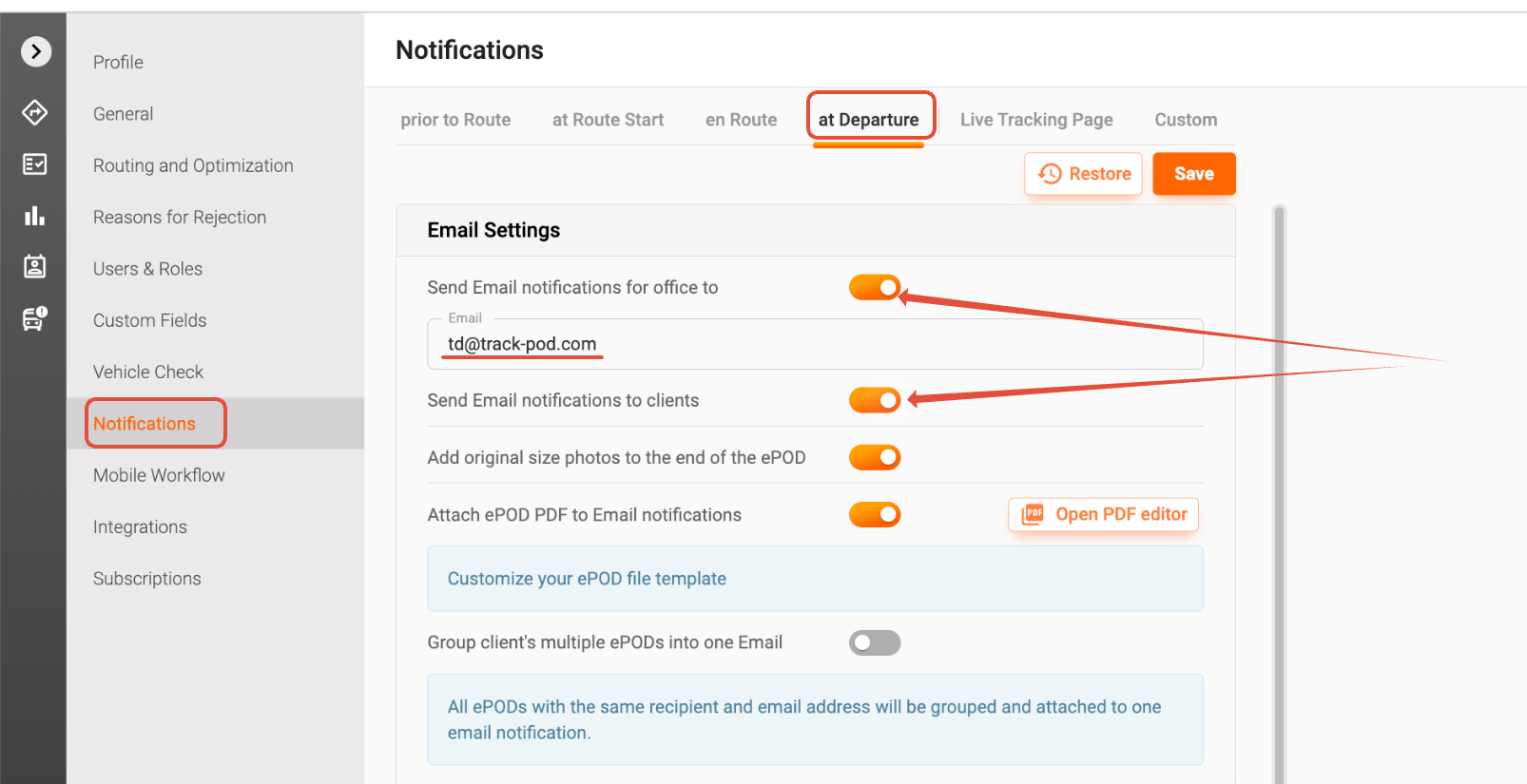 - ePOD Notifications (at Departure): These notifications are sent when the delivery departs from the customer’s site. Make sure this feature is enabled for your orders.