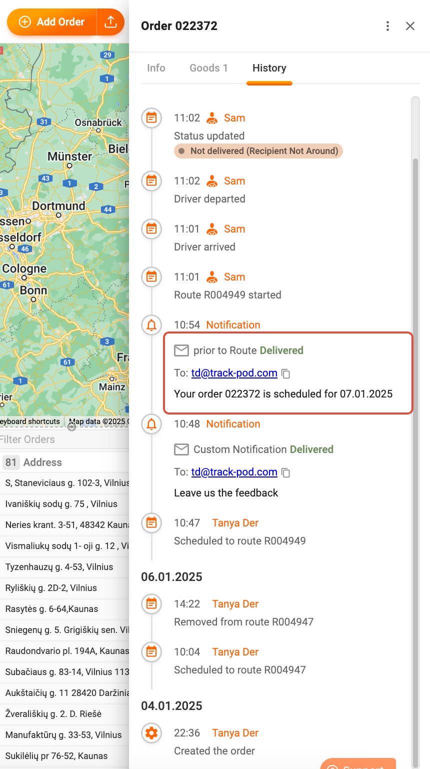 - Live Tracking with Actual ETA (en Route): Notifications are also sent with the estimated time of arrival (ETA) when the delivery departs from the previous stop. This feature helps keep your customers informed about when to expect their delivery.