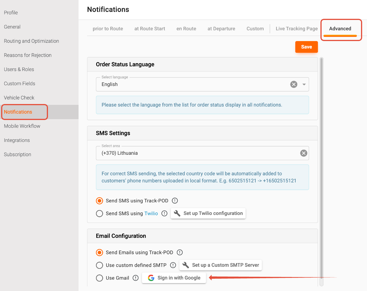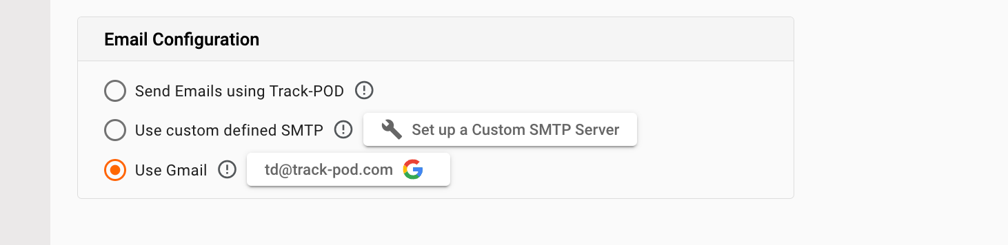 In Track-POD, you have the option to inform your customers through the Track-POD mail service (notifications will be dispatched from the No Reply Track-POD sender), your personally defined SMTP, or your Gmail.