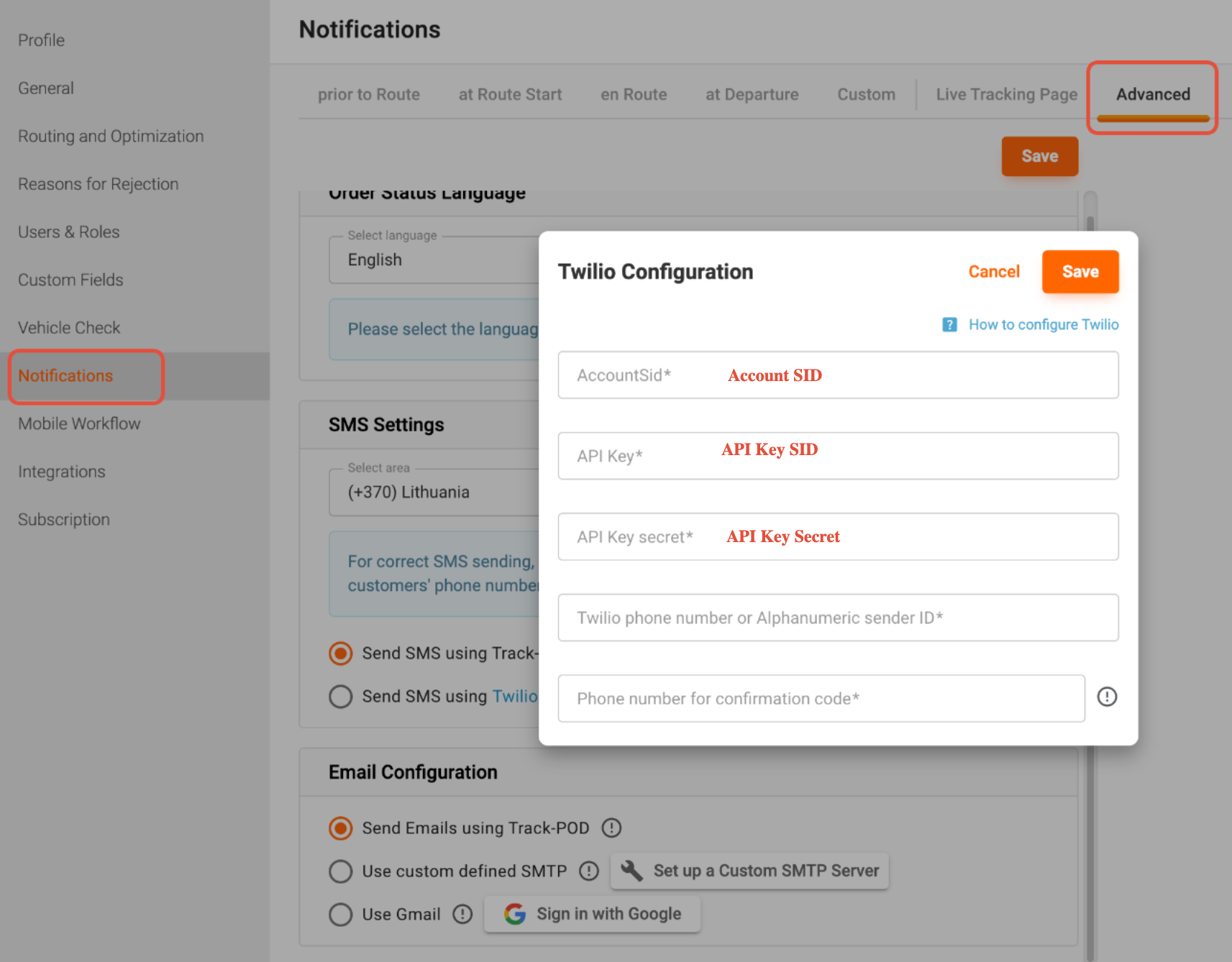 Track-POD allows you to send SMS notifications to your customers using either a numeric number or an Alphanumeric Sender ID such as 'Track-POD'. If you already have a Twilio account, you can easily configure Track-POD to send notifications through your Twilio phone number. If you haven't signed up for Twilio yet, we recommend doing so to take advantage of this feature.