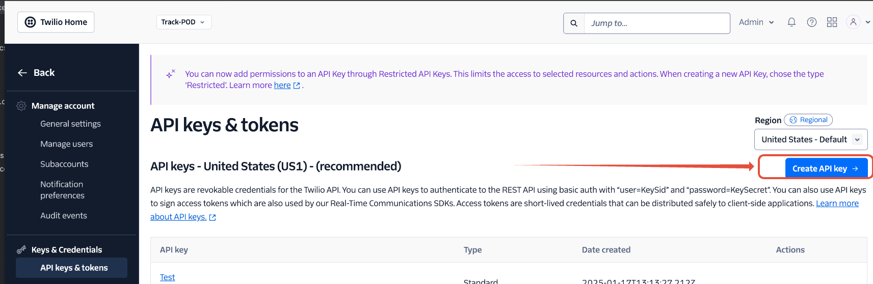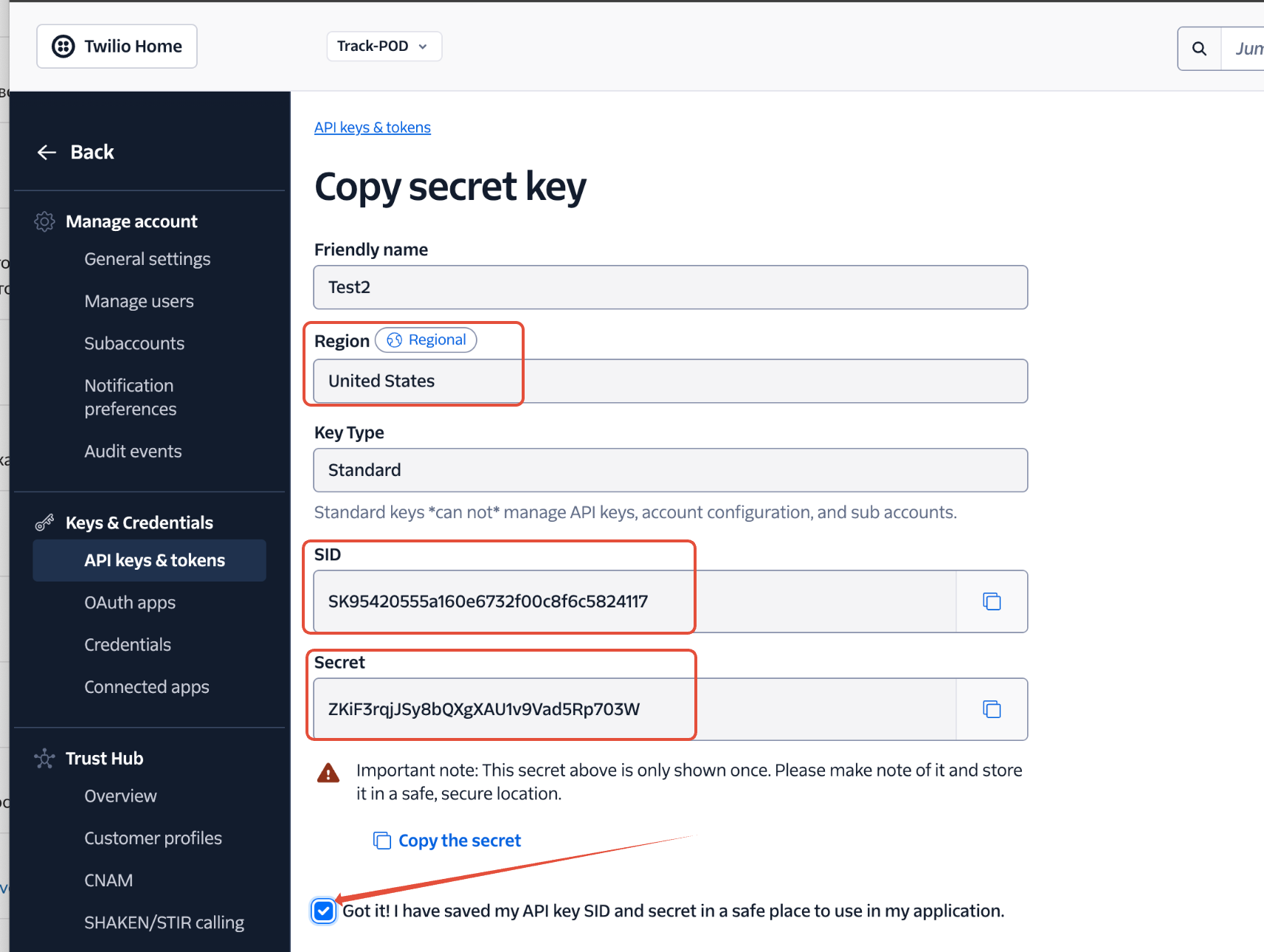 - After creating the API key, copy and securely store both the API Key SID and Secret. It’s important to set the API Key region to the United States due to restrictions in other regions.