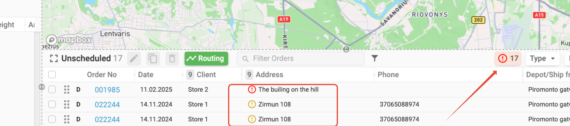When you import orders with new addresses into Track-POD, they are geocoded for display on the map or for route optimization. However, you may occasionally encounter yellow or red exclamation marks near the addresses, indicating potential geocoding issues. Here’s what these marks mean and how to resolve them.