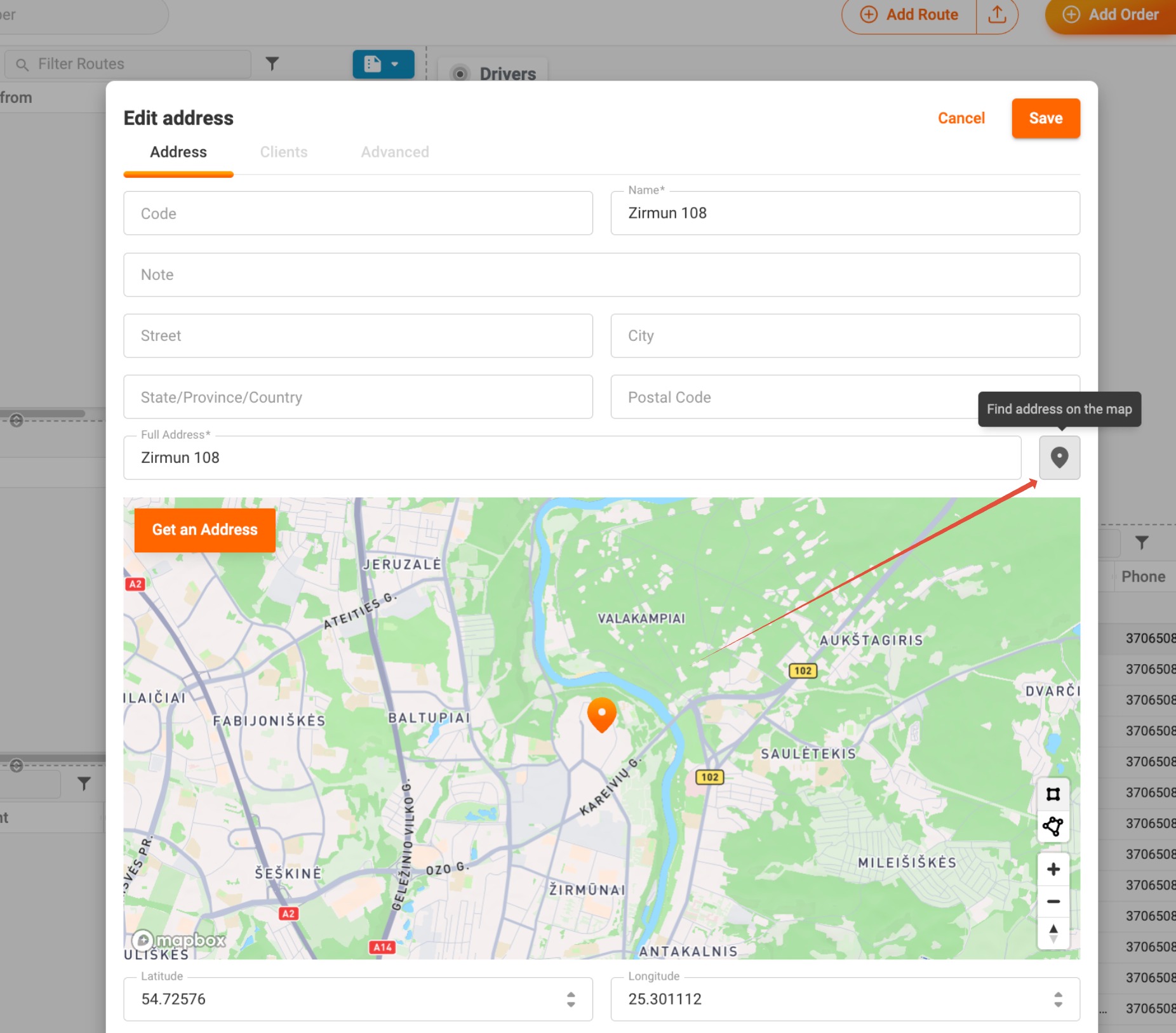 3. Find Address on the Map: Click the Find address on the map button. If the pin is incorrectly placed, you can edit the address directly. If the address still cannot be geocoded, try clicking on the map at the correct pin location and select Get Address. This feature allows you to manually adjust the location for accuracy.