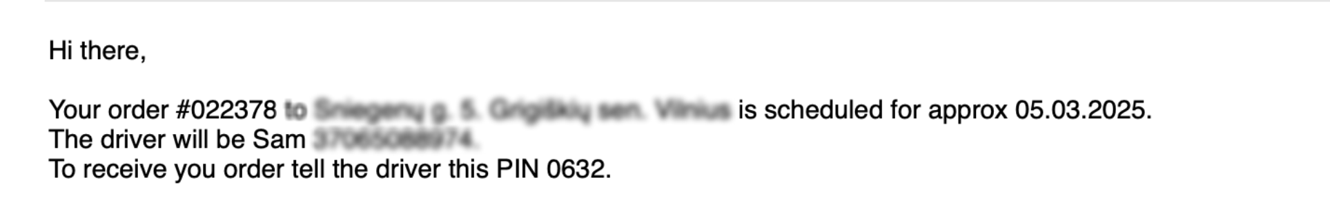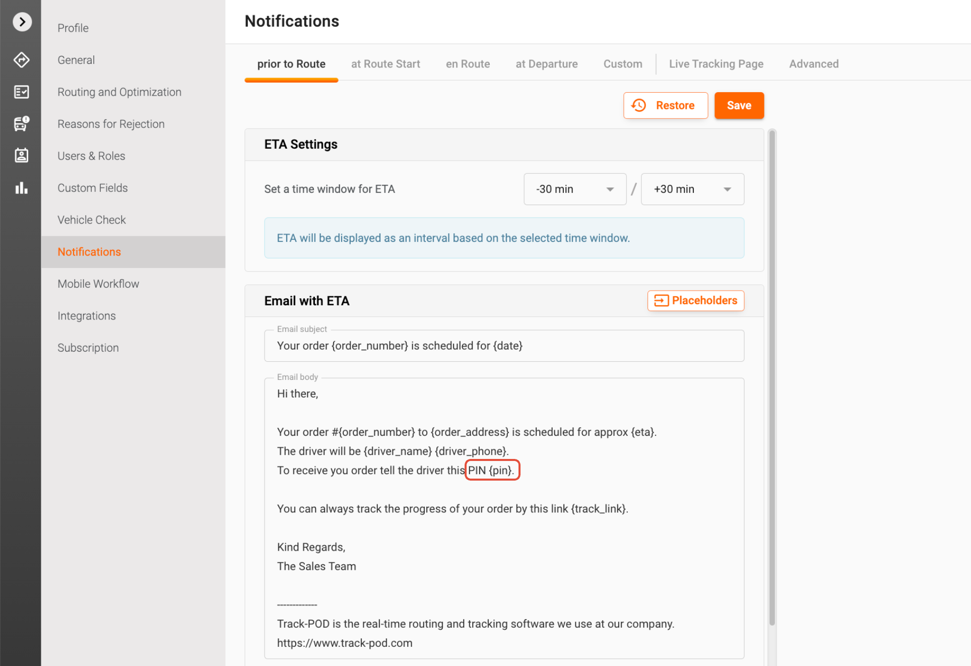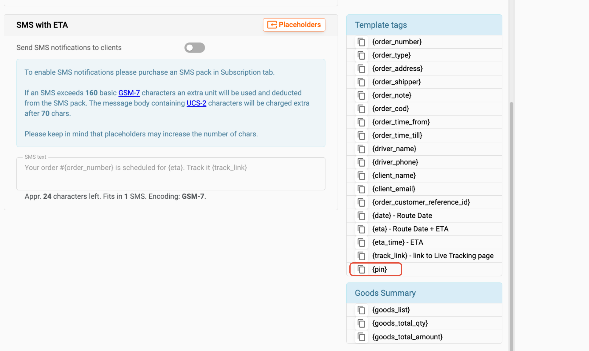 After enabling the PIN code confirmation, add the PIN placeholder to your email and SMS notifications. This means that whenever you send notifications to your customers, they will receive a unique PIN code that is generated for their specific delivery.