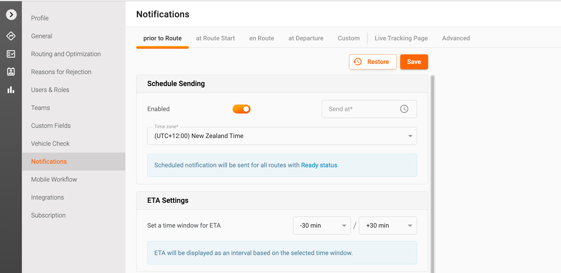 - Triggering Notifications: When your routes are marked as Ready, the system will automatically trigger the notifications at the pre-scheduled time.