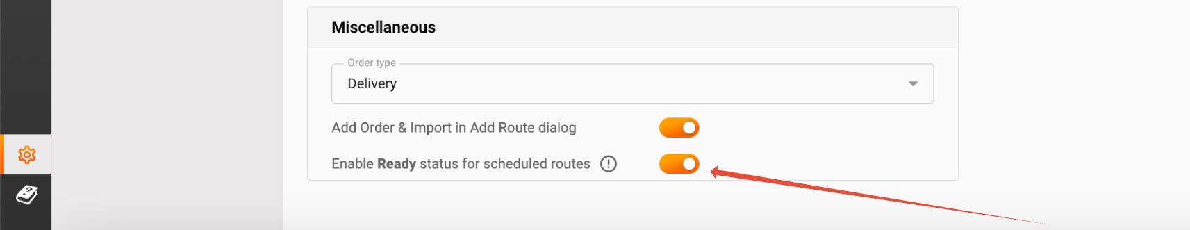 - Route Status: Please note that scheduling notifications will only work for routes with the status Ready. This status indicates that the orders within the route are prepared for dispatch and is assigned manually by a dispatcher or another web user. To ensure this status is available, go to Settings -> General -> Miscellaneous and enable the relevant setting.
