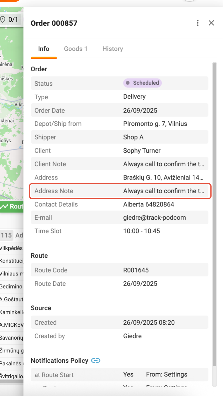 - Once you have selected the address, this note will then appear on the order summary, allowing you to keep track of any important details related to that address.