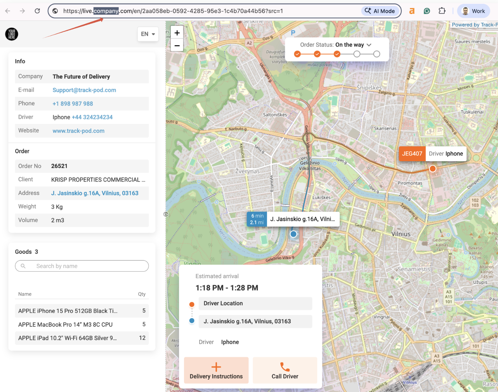 - Domain Personalization: You have the option to personalize the live-tracking page with your own domain. This means that instead of a generic URL, your customers will access the tracking page through a link that reflects your brand, further enhancing credibility.
