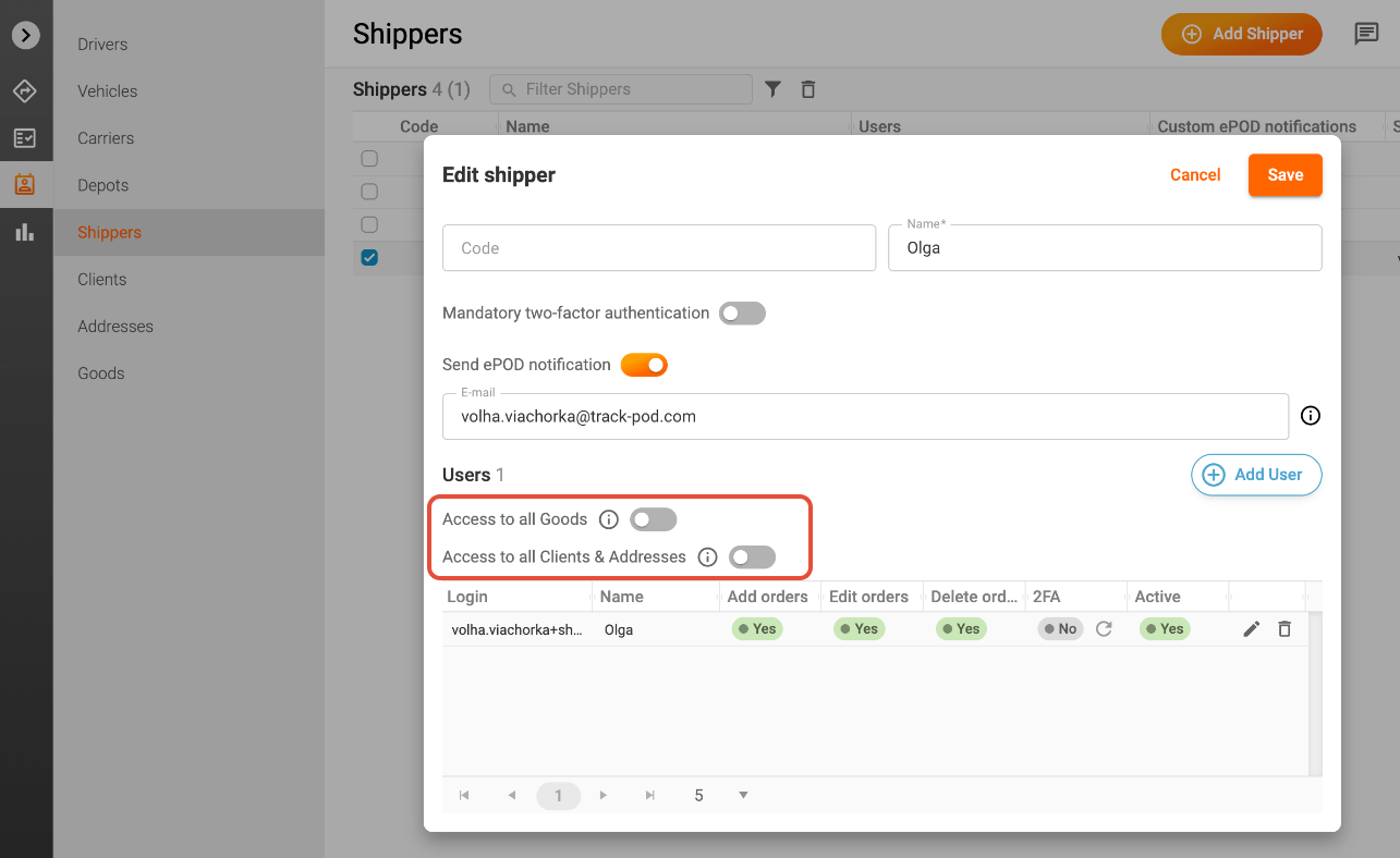 3. Access to Existing Directories: In addition to associating the Shipper with a Depot, you have the option to grant them access to existing Directories in full or to limit their access to Addresses, Clients, Goods related to them only. This includes: