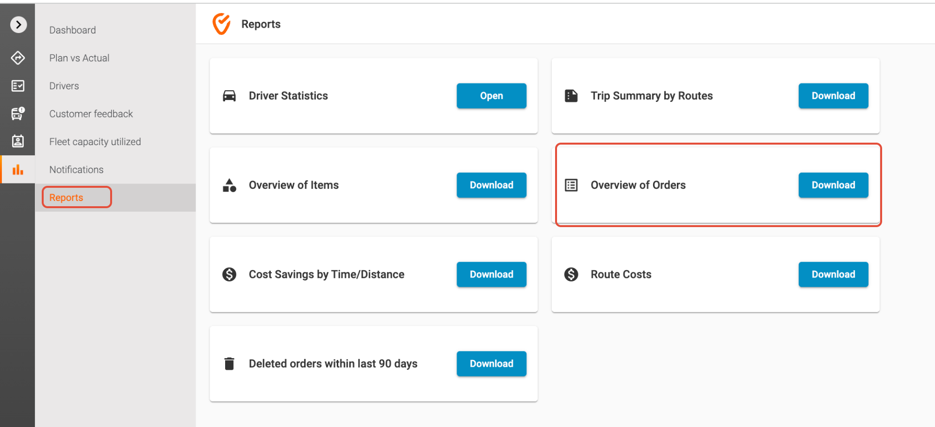 1. Access the Reports Section: Navigate to the Reports section and select the Overview of Orders option.