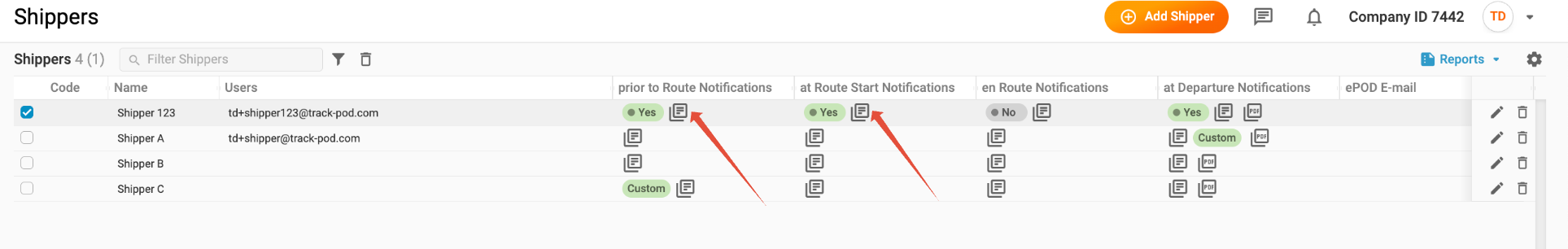 2. Optional: customize the sending of various types of notifications; for example, for Shipper 123, notifications will be sent before routes, at the route start, and at departure, while notifications en route will be omitted.