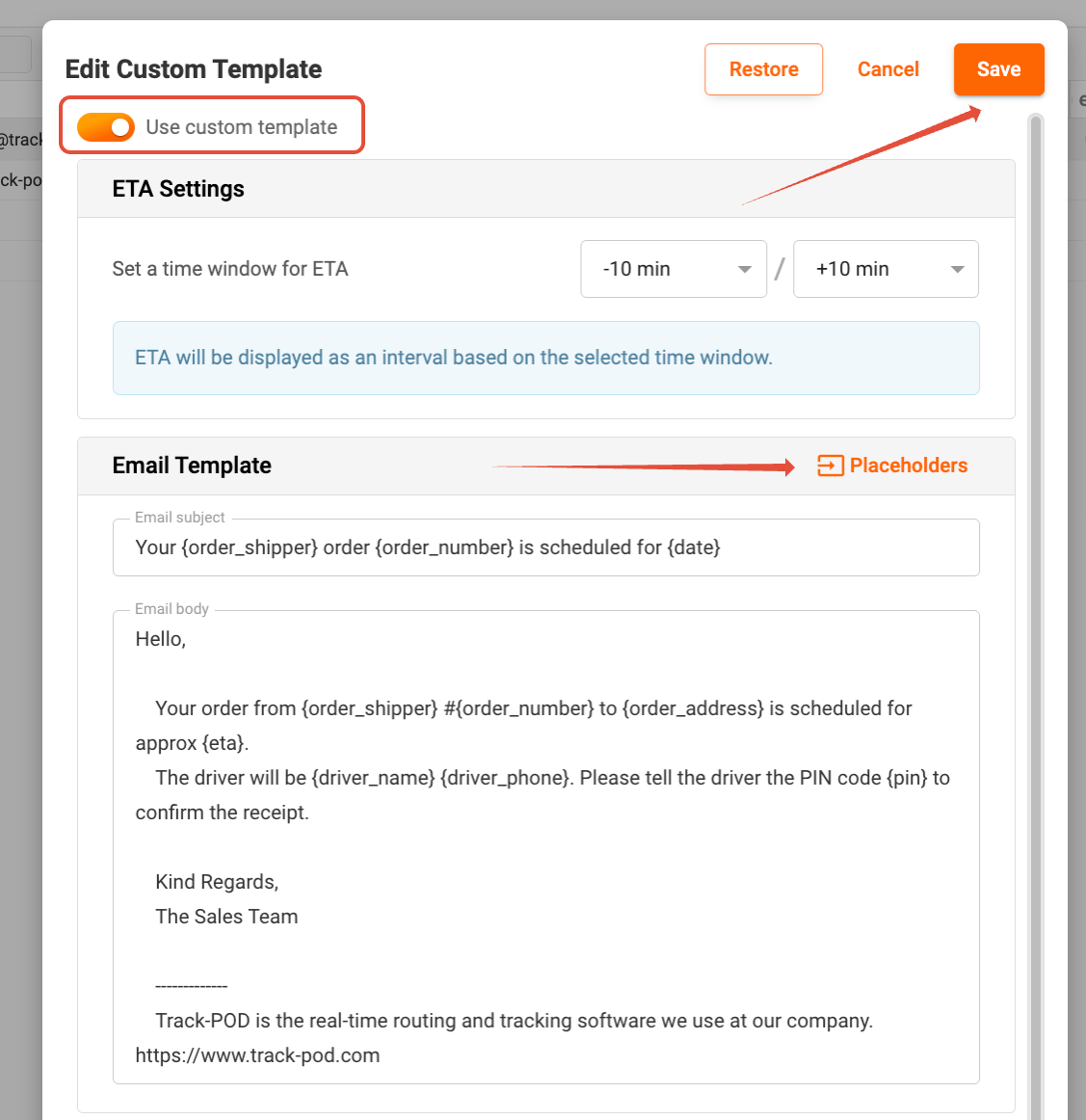 4. Edit Custom Template: In the Edit Custom Template window, you can modify the default notification template. Utilize the list of available placeholders to personalize your messages. Don’t forget to enable the toggle for Use custom template; you can disable custom notifications at any time if needed. Once you’re satisfied with your changes, click Save to apply the new template.